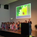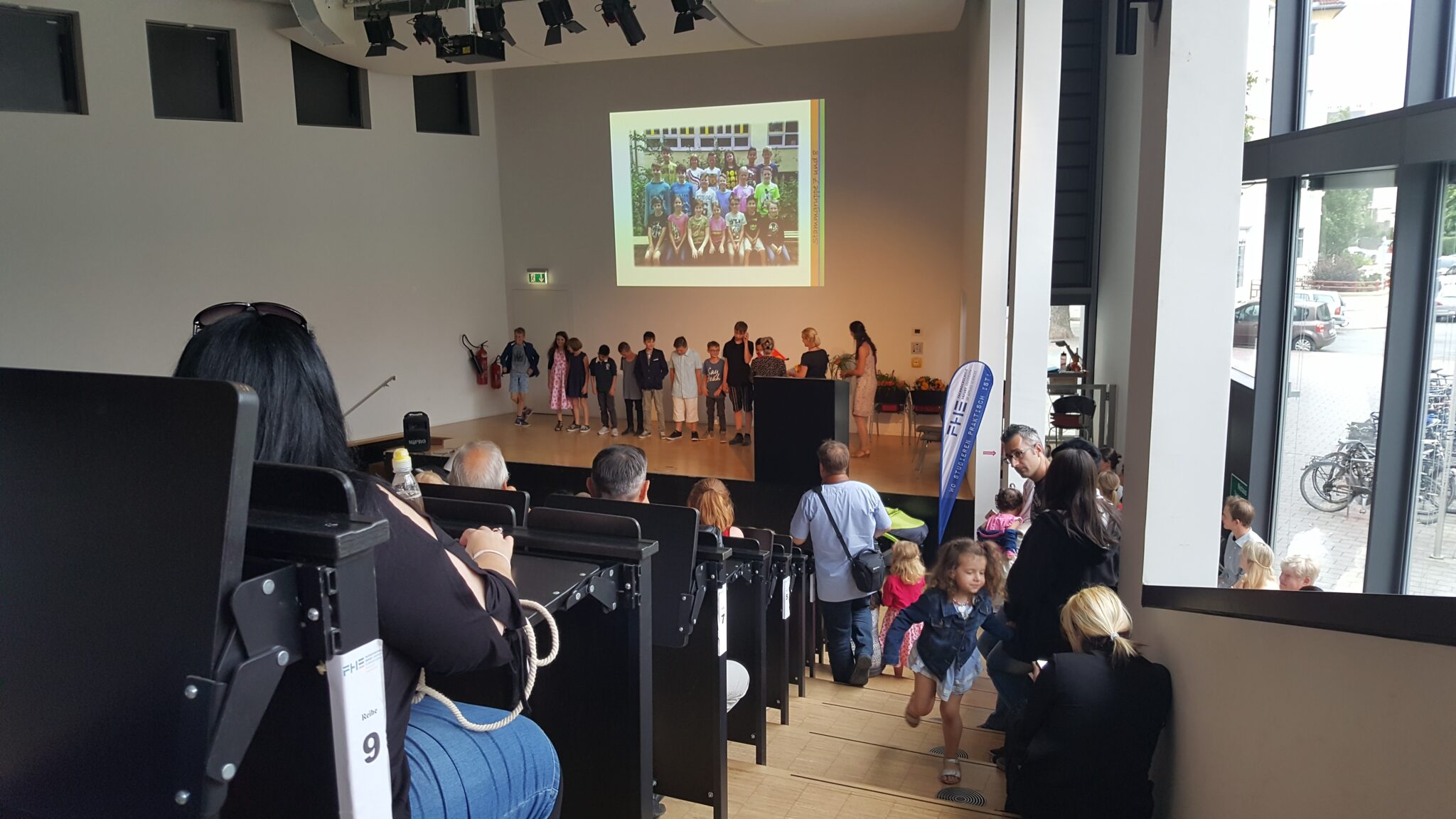 Am 28. Juni wurden im AudiMax der FH unsere Kinder aus dem Kurs 4 feierlich verabschiedet. Sie bekamen ihre Zeugnisse überreicht. Jedes Lernhaus studierte einen kleinen Beitrag ein und zeigte diesen auf der Bühne. Daneben gab es einige Fotos aus der Schulzeit, ein paar Worte von Frau Kühnelt und unserer Schülersprecherin Mariella sowie das ein oder andere Lied vom Schulchor. Insgesamt ein würdiger Abschluss der Grundschulzeit und die Einführung in die langersehnten Ferien, wenngleich sich sicherlich bei einigen Kindern, Eltern und Pädagogen ein kleines Tränchen im Auge bildete.
