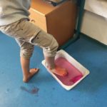 In der Stammgruppe 5 wurde es kitzelig. Die Kinder testeten mit den verschiedensten Materialien, was die eigenen Füße und Zehen alles schaffen und bewältigen können, unabhängig vom Stehen und Gehen. Das Ergebnis ist bunt. Es wurde viel gelacht und vielleicht hat das ein oder andere Kind ein wenig Muskelkater. Ein Freude war es sicher allemal.