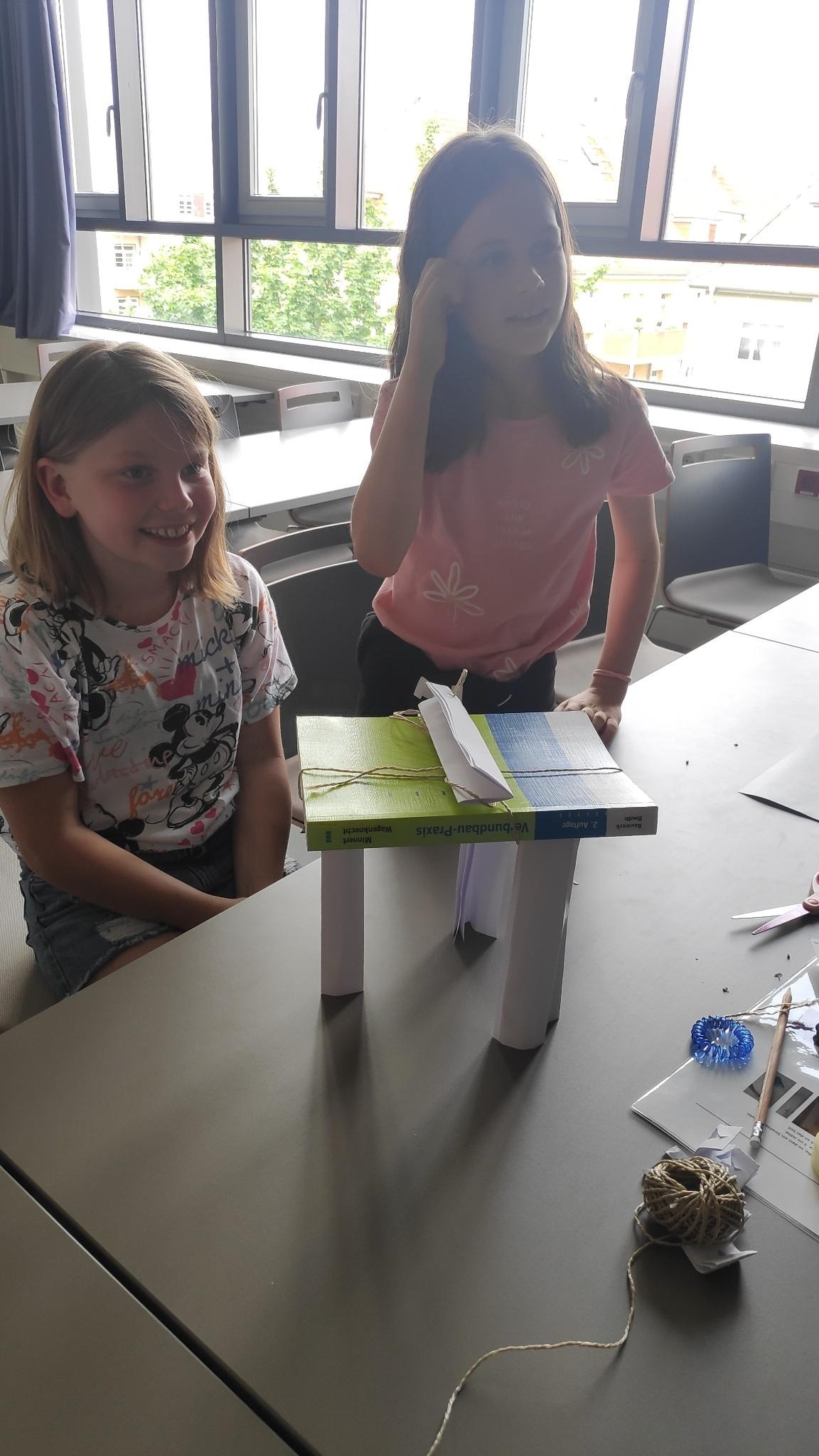 Am 23.5. forschte die STG 7 in der Kinderuniversität zu Thema „Wozu braucht man Statik?“. Es wurde getestet, welche Last ein gefaltetes Blatt Papier nach oben ziehen kann, welche Pfeiler-Form am stabilsten ist und wie eine tragfähige Brücke gebaut werden muss. Dabei entstanden viele kreative Bauwerke und es wurde viel ausprobiert.
