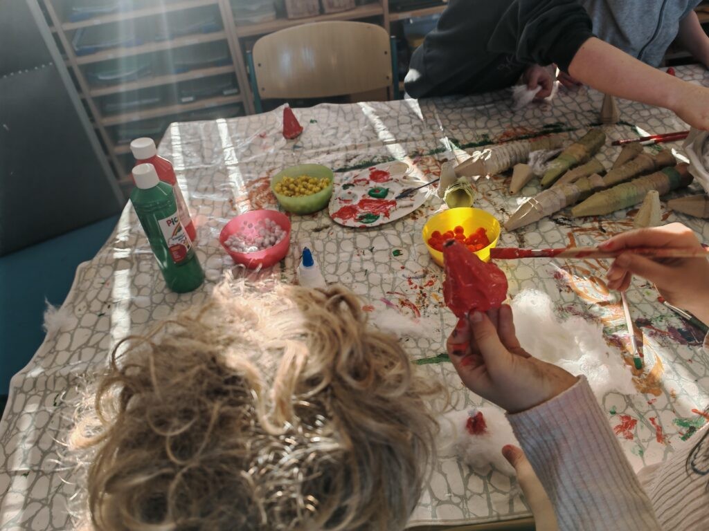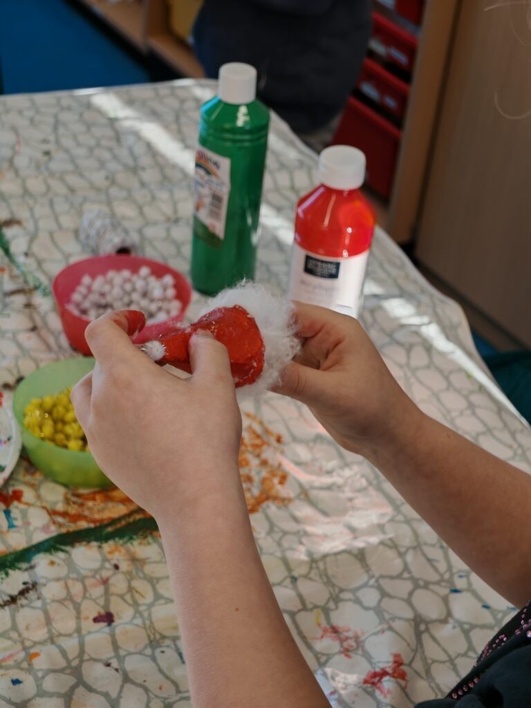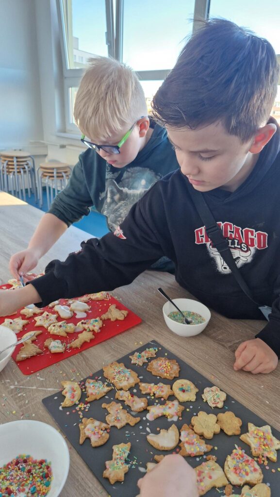 Auch kulinarisch wurde es festlich: Die Stammgruppen 15 und 16 backten Plätzchen aus Mürbeteig, während die Stammgruppe 4 einen Ausflug zum Eislaufen unternahm. In der Stammgruppe 1 und 2 entstanden kunstvolle Weihnachtskugeln mit Öl und bunte Fensterbilder. Außerdem sorgte bei den Stammgruppen 1 und 2 eine sportliche „Wichtelolympiade“ für Bewegung und Spaß.