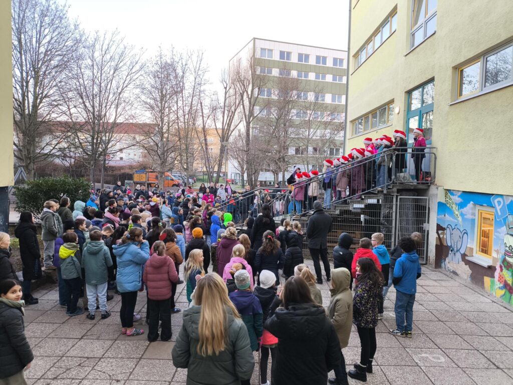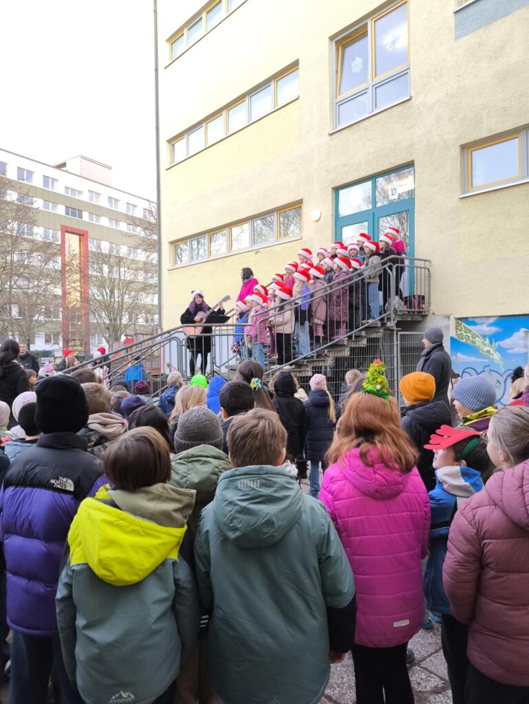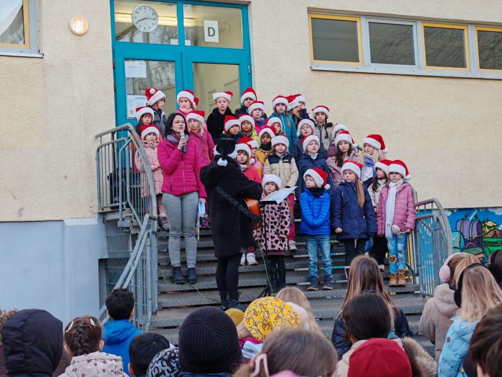 Am Montag, den 15. Dezember 2025, starteten wir feierlich in unsere Weihnachtswoche. Auf dem Schulhof stimmte der Chor mit besinnlichen Liedern auf die Adventszeit ein, begleitet von einer Eröffnungsrede von Frau Meiselbach.